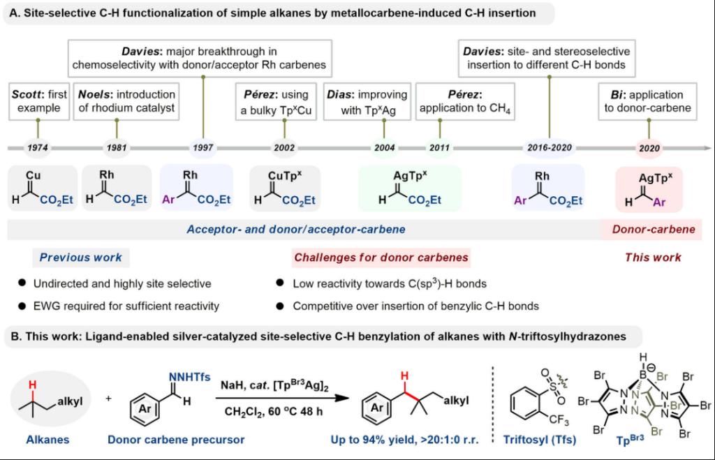 近日,我校化学学院毕锡和教授课题组在化学领域国际重要期刊《Chem》(IF = 19.735)发表题为“Site-selective C–H benzylation of alkanes with N-triftosylhydrazones leading to alkyl aromatics(烷烃的位点选择性C–H键苄基化反应)”的研究论文,这是利用烷烃高选择性构筑碳-碳键的重要进展。 烷烃是大宗的石油化工产品,其合成利用具有极高的研究价值,然而,由于烷烃碳氢键(Csp3−H)的内在惰性及各种Csp3−H键的键能差异小,...